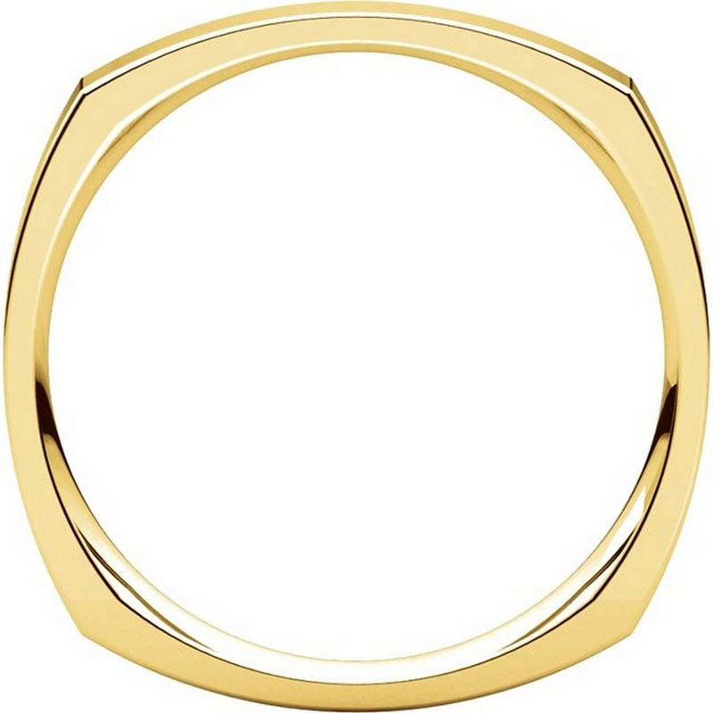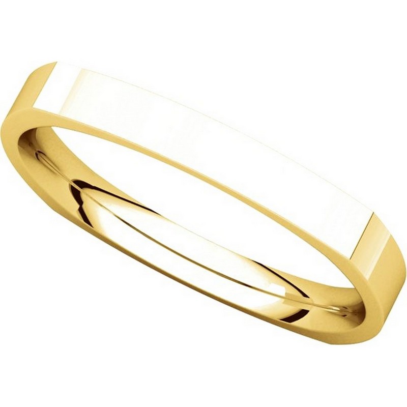14kt Yellow gold square, classic, comfort fit, 2.5mm wide wedding band. The ring is square shaped and the corners are slightly thicker than the center portion of the band. The ring is matte finish. Different finishes may be selected.