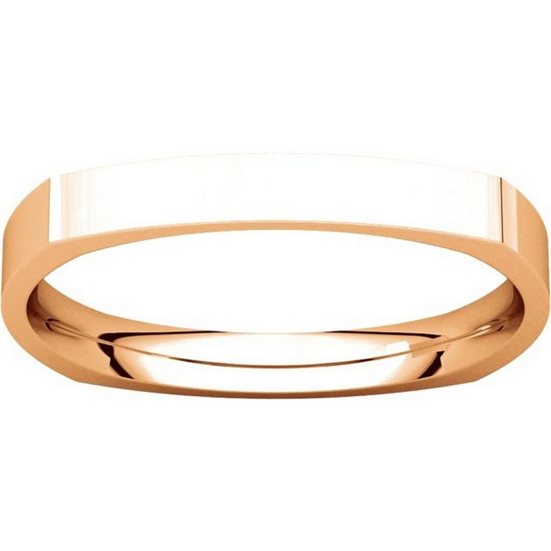 18K Roset gold square, classic, comfort fit, 2.5 mm wide wedding band. The ring is square shaped and the corners are slightly thicker than the center portion of the band. The ring is matte finish. Different finishes may be selected.