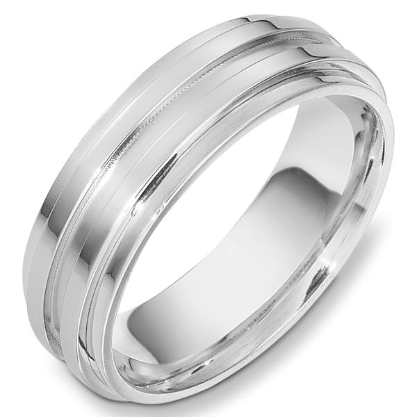 Platinum contemporary, comfort fit, 7.0mm wide wedding band. The center part of the ring is matte finish and the rest has a polished finish. Different finishes may be selected or specified.