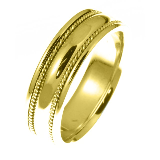 18kt Yellow gold handcrafted, comfort fit, 7.0mm wide wedding band. The ring has a beautiful design with a handcrafted rope on each side. The ring has a polished finish. Different finishes may be selected or specified.