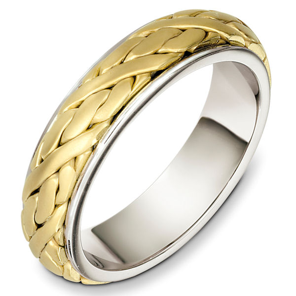 Platinum and 18kt yellow gold handcrafted, comfort fit, 6.0mm wide wedding band. The ring has a beautiful handcrafted braid in the center that has a matte finish. Different finishes may be selected or specified.