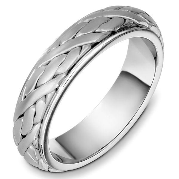 Platinum handcrafted, comfort fit, 6.0mm wide wedding band. The ring has a beautiful handcrafted braid in the center that has a matte finish. Different finishes may be selected or specified.