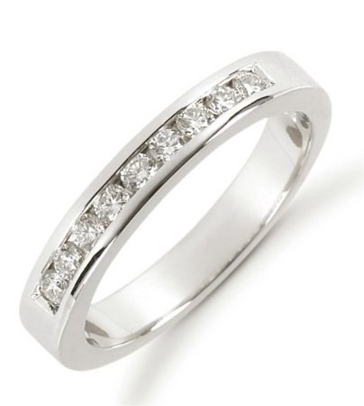18Kt White gold anniversary band. The ring holds 9 round brilliant cut diamonds each measures 2.0 mm in size. The diamonds are approximately 0.25 ct tw, VS1-2 in clarity, very clean and G-H in color, near colorless to colorless. The diamonds are channel set. The band is about 3.0 mm wide. The finish is polished. Different finishes may be selected or specified.