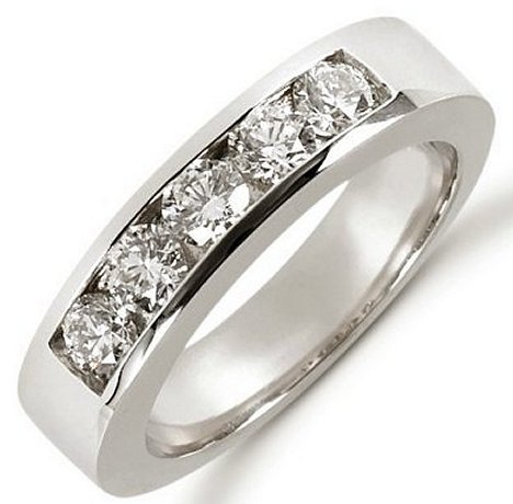 14kt white gold anniversary band. The ring holds 5 round brilliant cut diamonds each measures 3.8 mm in size. The diamonds are approximately 1.00ct tw, VS1-2 in clarity, very clean and G-H in color, near colorless. The diamonds are channel set. The band is about 5.0 mm wide. The finish is polished. Different finishes may be selected or specified.