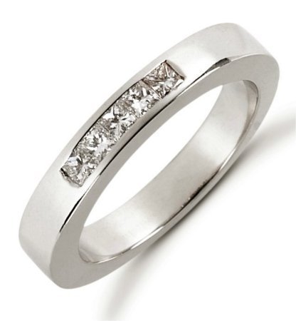 18Kt White gold anniversary band. The ring holds 5 princess cut diamonds each measures 2x2 mm in size. The diamonds are approximately 0.25 ct tw, VS1-2 in clarity, very clean and G-H in color, near colorless to colorless. The diamonds are set in a channel. The band is about 3.0 mm wide. The finish is polished. Different finishes may be selected or specified.