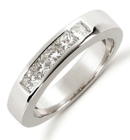 Palladium anniversary band. The ring holds 5 princess cut diamonds each measures 2.5x2.5 mm in size. The diamonds are approximately 0.50 ct tw, VS1-2 in clarity, very clean and G-H in color, near colorless to colorless. The diamonds are set in a channel. The band is about 3.5 mm wide. The finish is polished. Different finishes may be selected or specified.