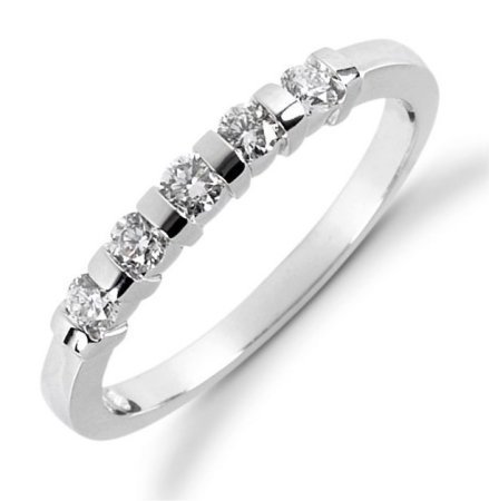 18Kt White gold anniversary band. The ring holds 5 round brilliant cut diamonds, each measures 2.4 mm. The diamonds are approximately 0.25 ct tw, VS1-2 in clarity, very clean and G-H in color, near colorless to coloress. The diamonds are set in single channels. The band is about 3.0 mm wide. The finish is polished. Different finishes may be selected or specified.