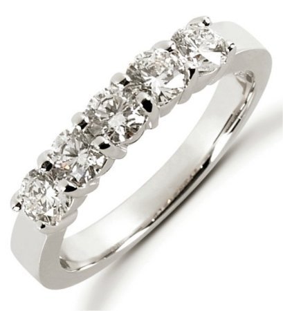 Platinum anniversary band. The ring holds 5 round brilliant cut diamonds each measures about 3.8 mm in size. The diamonds are approximately 1.00 ct tw, VS1-2 in clarity, very clean and G-H in color, near colorless to colorless. The band is about 4.5 mm wide and each diamond is set in prongs. The finish is polished. Different finishes may be selected.