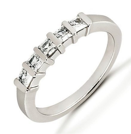 Platinum anniversary band. The ring holds 5 princess cut diamonds each measures about 2.5x2.5 mm in size. The diamonds are approximately 0.50 ct tw, VS1-2 in clarity, very clean and G-H in color, near colorless to colorless. The band is about 3.5 mm wide. The finish is polished. Different finishes may be selected.