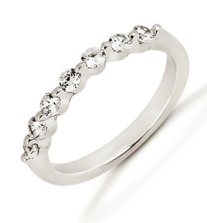 Palladium anniversary band. The ring holds 7 round brilliant cut diamonds each measures 2.4 mm in size. The diamonds are approximately 0.35 ct tw, VS1-2 in clarity, very clean and G-H in color, near colorless to colorless. The band is about 3.0 mm in width and each diamond is set with a single prong. The finish is polished. Different finishes may be selected.