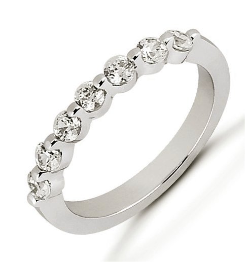 18Kt White gold anniversary band. The ring holds 7 round brilliant cut diamonds each measures 2.7 mm in size. The diamonds are approximately 0.49 ct tw, VS1-2 in clarity, very clean and G-H in color, near colorless to colorless. The band is about 3.5 mm in width and each diamond is set with a single prong. The finish is polished. Different finishes may be selected.