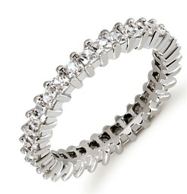 Palladium eternity ring. The ring holds 31 princess cut diamonds each measures 2x2 mm in size 6. The diamonds are approximately 1.55 ct tw, VS1-2 in clarity, very clean and G-H in color, near colorless to colorless. The band is about 2.5 mm in width. Each diamond is set in prongs and the number of diamonds in each ring may be more for larger sizes. The finish is polished. Different finishes may be selected.