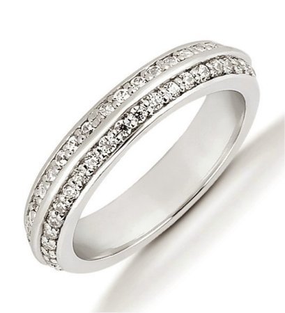 14Kt White gold eternity ring. The ring holds 82 round brilliant cut diamonds in 2 rows each measures 1.3 mm in size. The diamonds are approximately 0.82 ct tw, VS1-2 in clarity, very clean and G-H in color, near colorless to colorless. The band is about 4.0 mm wide. Each diamond is set in prongs and more diamonds may be used for larger ring sizes. The finish is polished. Different finishes may be selected.