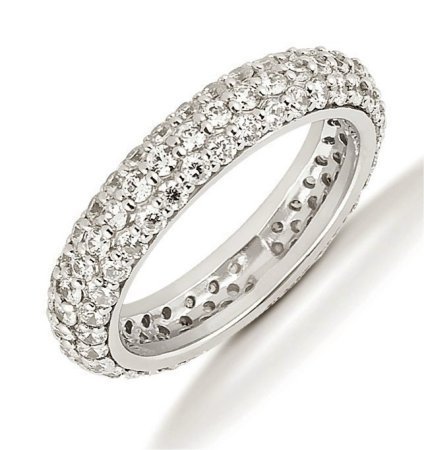 Palladium eternity ring. Three rows of diamonds hold 34 round brilliant cut diamonds each measures 1.7 mm in size and 68 round brilliant cut diamonds that measure 1.5 mm in size. The diamonds are approximately 1.70 ct tw, VS1-2 in clarity, very clean and G-H in color, near colorless to colorless. The band is about 4.5 mm wide. Each diamond is set in prongs and the number of diamonds may be more for larger sizes. The finish is polished. Different finishes may be selected.