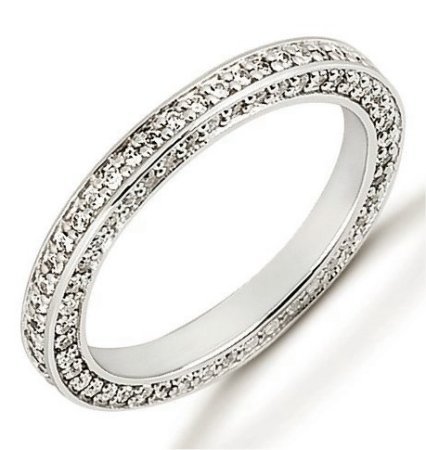 Palladium eternity ring. The ring holds 143 round brilliant cut diamonds each measures 1.0 mm in size. The diamonds are approximately 0.72 ct tw, VS1-2 in clarity, very clean and G-H in color, near colorless to colorless. The band is about 3.0 mm wide. Each diamond is set in prongs and there may be more diamonds in larger size rings. The finish is polished. Different finishes may be selected.