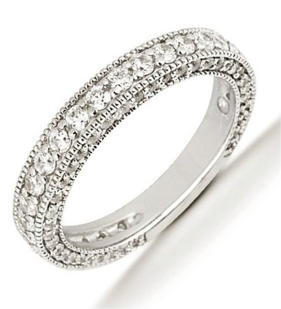 14Kt White gold anniversary band. The ring holds 26 round brilliant cut diamonds that measures 2.0 mm, 2 round brilliant cut diamonds that measures 1.5 mm, 32 round brilliant cut diamonds that measures 1.3 mm, 28 round brilliant cut diamonds that measure 1.2 mm, and 12 round brilliant cut diamonds that measure 1.0 mm. The diamonds are approximately 1.40 ct tw, VS1-2 in clarity, very clean and G-H in color, near colorless to colorless. There are diamonds set both in the center of the band and on the sides with prongs. The band is about 3.5 mm wide.
