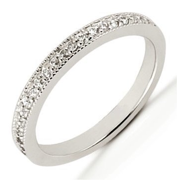 Platinum anniversary band. The ring holds 23 round brilliant cut diamonds set in prongs, each measures 1.3 mm. The diamonds are approximately 0.25 ct tw, VS1-2 in clarity, very clean and G-H in color, near colorless to colorless. The band is about 2.0 mm wide. The finish is polished. Different finishes may be selected.