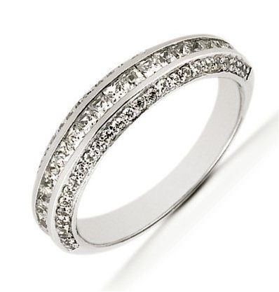 18Kt White gold anniversary band. The ring holds 21 princess cut diamonds that measure 1.5x1.5 mm and 54 round brilliant cut diamonds that measure 1.2 mm. The diamonds are approximately 0.95 ct tw, VS1-2 in clarity, very clean and G-H in color, near colorless to colorless. The princess cut diamonds are set in a channel and the round brilliant cut diamonds are set in prongs. There are diamonds in the center of the band and set on the side. The band is about 4.5 mm wide. The finish is polished. Different finishes may be selected.