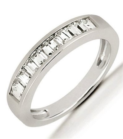 Palladium anniversary band. The ring holds 11 straight baguette cut diamonds, each measures 2x1.5 mm. The diamonds are approximately 0.33 ct tw, VS1-2 in clarity, very clean and G-H in color, near colorless to colorless. The diamonds are set in a channel. The band is about 3.5 mm wide. The finish is polished. Different finishes may be selected.