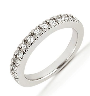 Palladium anniversary band. The ring holds 18 round brilliant cut diamonds, each measures 1.5 mm. The diamonds are approximately 0.27 ct tw, VS1-2 in clarity, very clean and G-H in color, near colorless to colorless. The diamonds are set in prongs. The band is about 2.5 mm wide. The finish is polished. Different finishes may be selected.