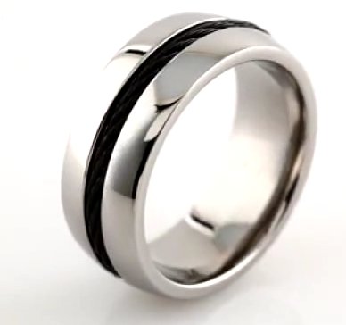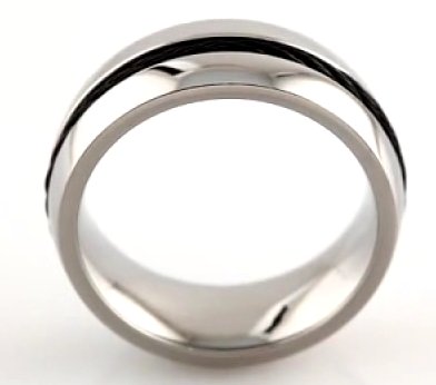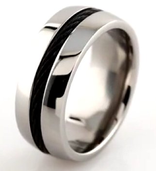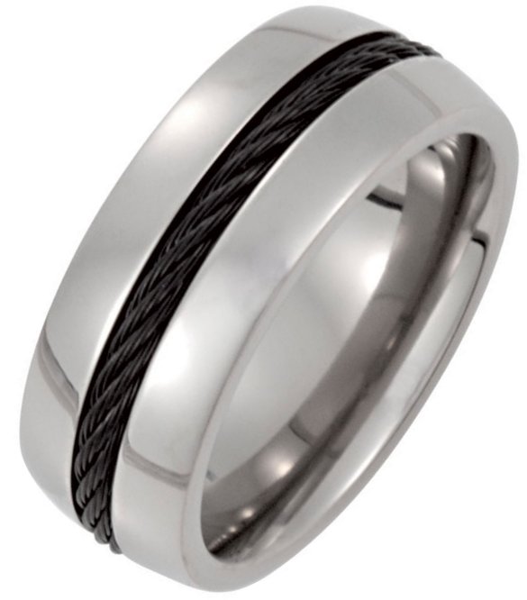 Titanium, 8.0mm wide , comfort fit, black cable in the center, polished wedding band. It is available between size 9.0-13.0 in half size increments.