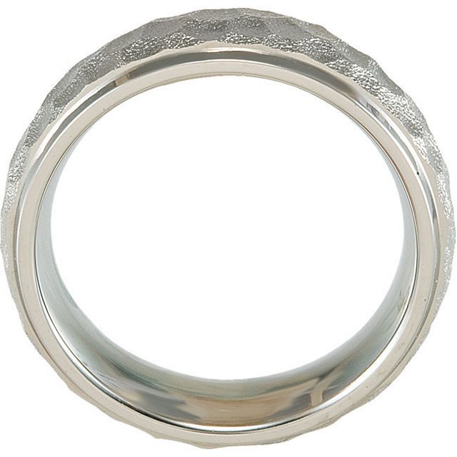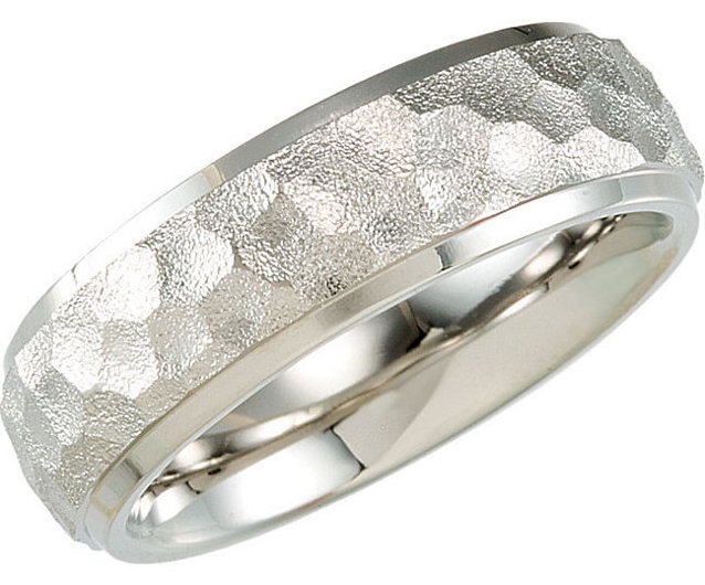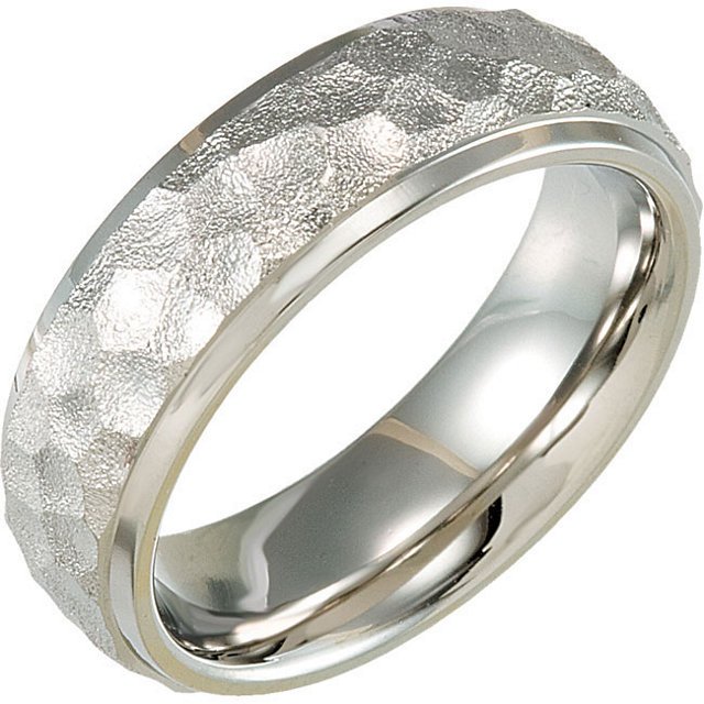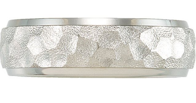 Titanium, 7.0mm wide, comfort fit, hammered center with polished edges wedding band. It is available between size 8.0-13.0 in half size increments