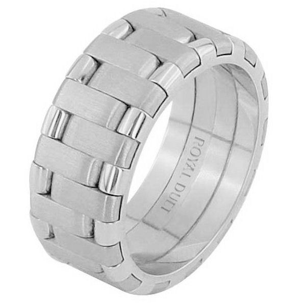 14 kt white gold, 8.0 mm wide, comfort fit, wedding ring. The band has a beautiful design made with white gold. There is a mix of brushed and polished finishes. Other finishes may be selected or specified.