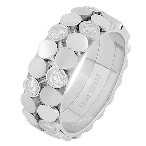 18 kt white gold, comfort fit, 6.85 mm wide, diamond ring. The band has a beautiful design made with white gold and bezel set diamonds around the whole ring. It has about 0.98 ct tw round brilliant cut diamonds, that are VS1-2 in clarity and G-H in color.