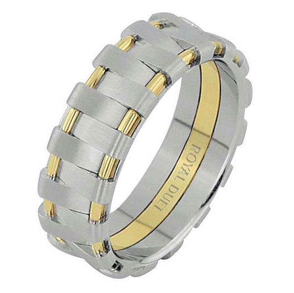 18 kt two-tone gold, 7.0 mm wide, comfort fit, wedding ring. The band combines white and yellow gold in a unique design. There is a mix of brushed and polished finishes. Other finishes may be selected or specified.