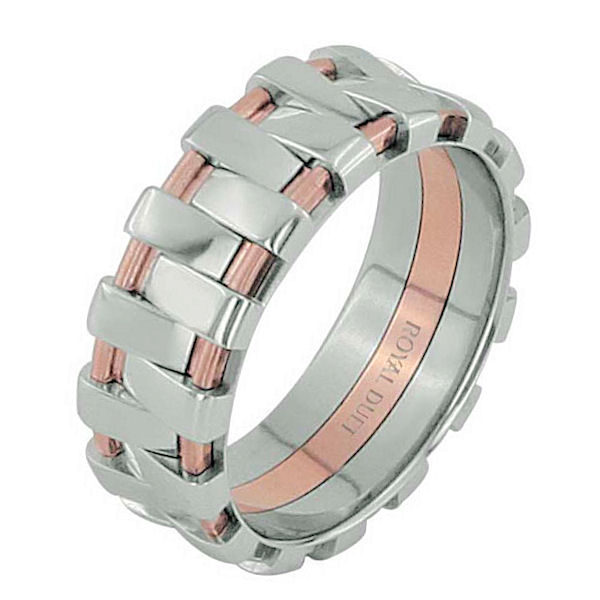 14 kt rose and white gold, 7.0 mm wide, comfort fit, wedding ring. The band combines white and rose gold together in a unique desgin. There is a mix of brushed and polished finishes. Other finishes may be selected or specified.