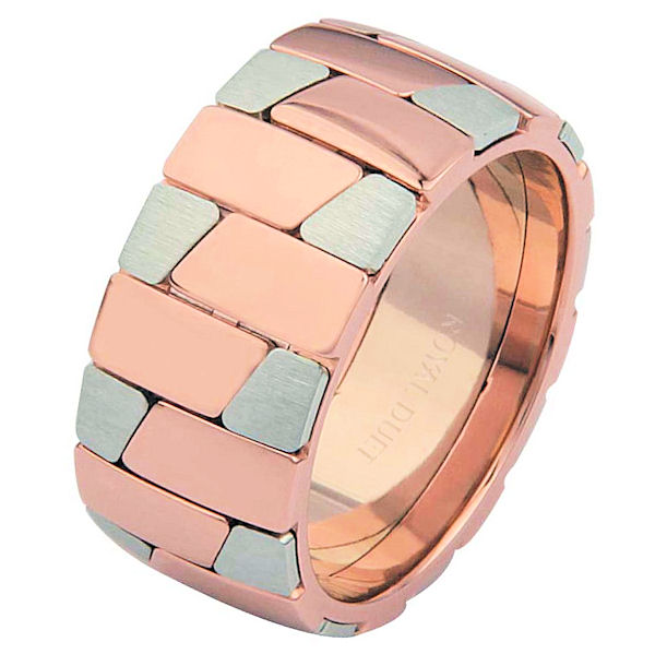 18 kt white and rose gold, comfort fit, 9.25 mm wide, wedding ring. This ring has a unique blend of white and rose gold. The white gold portion is brushed finish and the rose gold is polished. Different finishes may be selected or specified.