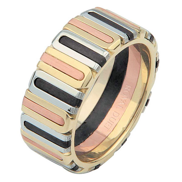 18 kt tri-color gold, black rhodium, comfort fit, 8.1 mm wide, wedding ring. The band has a unique blend and fusion of tri-color gold with black rhodium. It has a mix of brushed and polished finishes. Different finishes may be selected or specified.