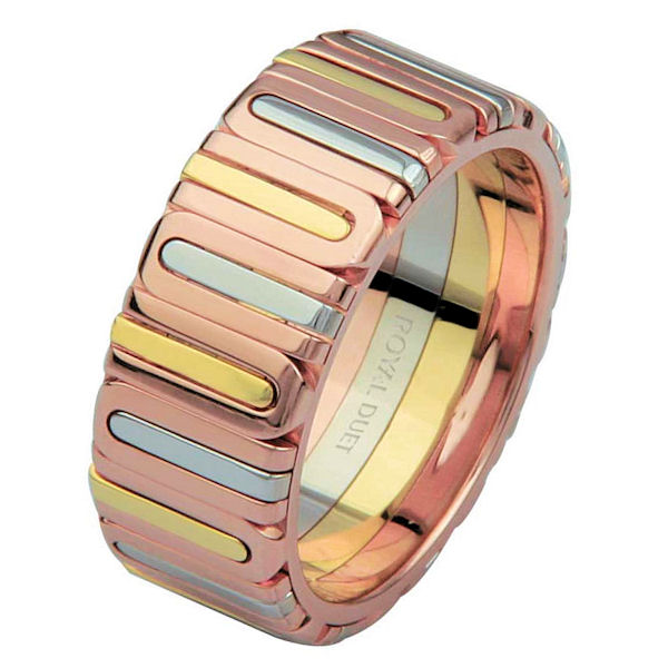 14 kt tri-color gold, comfort fit, 8.1 mm wide, wedding ring. The band fuses and blends the different colors of gold. It is all polished finish. Different finishes may be selected or specified.