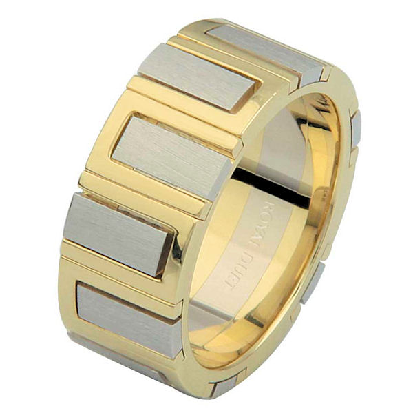 14 kt two-tone gold, comfort fit, 8.1 mm wide, wedding ring. The band has unique blend of yellow and white gold. It has a mixture of brushed and polished finishes. Different finishes may be selected or specified.