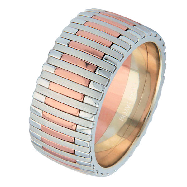 18 kt rose and white gold, comfort fit 9.3 wide, wedding ring. The band has a unique blend of white and rose gold with a mixture of brushed and polished finishes. Different finishes may be selected or specified.