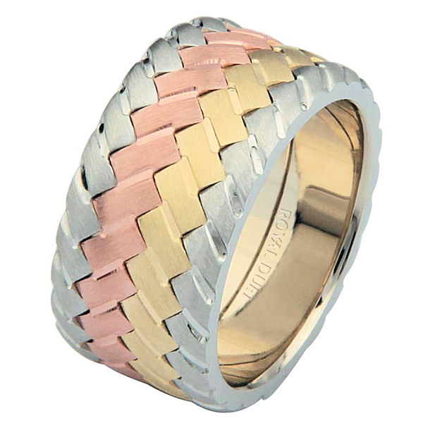 18 kt tri-color, comfort fit, 10.2 mm wide, wedding ring. The band has a unique blend of white, yellow and rose gold fused together. It has a brushed finish. Different finishes may be selected or specified.