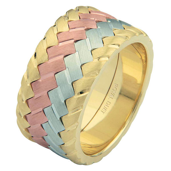 14 kt tri-color, comfort fit, 10.2 mm wide, wedding ring. The band has a unique blend of white, yellow and rose gold fused together. It has a brushed finish. Different finishes may be selected or specified.