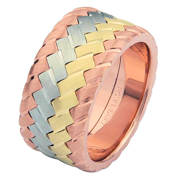 14 kt tri-color, comfort fit, 10.2 mm wide, wedding ring. The band has a unique blend of white, yellow and rose gold fused together. It has a brushed finish. Different finishes may be selected or specified.