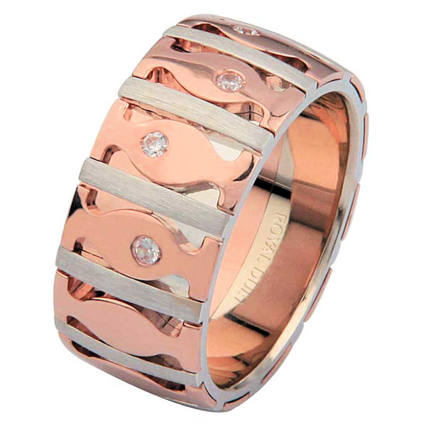 14 kt white and rose gold, comfort fit, 9.15 mm wide wedding ring. The band has a unique combination of white and rose gold with diamonds set into the ring. It has approximately 0.10 ct tw round brilliant cut diamonds, that are VS1-2 in clarity and G-H in color. The white gold is brushed finished and the rose gold is polished. Different finishes may be selected or specified.