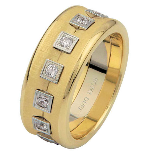 14 kt two-tone gold, comfort fit, 8.20 mm wide, eternity diamond wedding ring. The band has a unique blend of white and yellow gold with diamonds set in the center. The shape of band is concaved. It has approximately 0.52 ct tw round brilliant cut diamonds, that are VS1-2 in clarity and G-H in color. The yellow gold has a strong brush finish with edges polished. Different finishes may be selected or specified.
