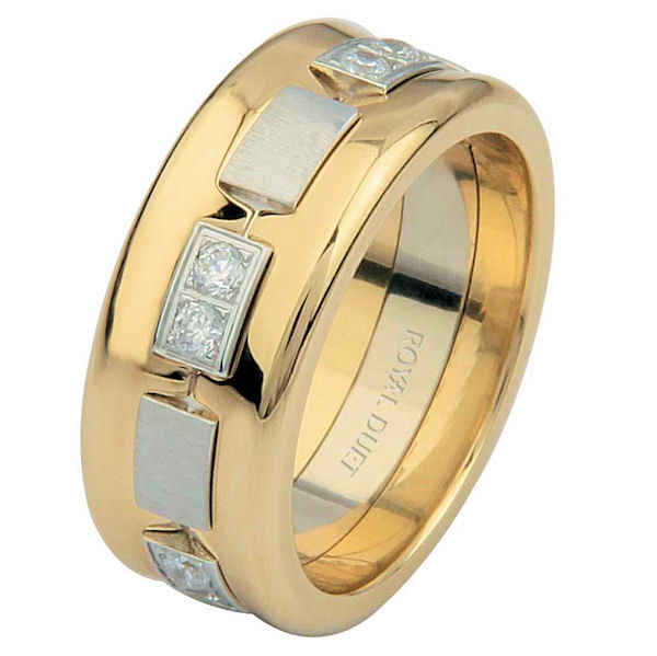 18 kt two-tone, comfort fit, 8.20 mm wide, diamond concaved ring. The band is concaved and combines the white and yellow gold with diamonds set in the center. It has approximately 0.35 ct tw brilliant round cut diamonds, that are VS1-2 in clarity and G-H in color. The yellow gold portion is polished and the white gold is brushed. Different finishes may be selected or specified.
