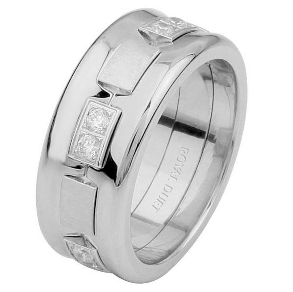 14 kt white gold, comfort fit, 8.20 mm wide, diamond concaved ring. The band is concaved with the diamonds set in the center. It has approximately 0.35 ct tw brilliant round cut diamonds, that are VS1-2 in clarity and G-H in color. The concaved portion is polished and the white gold pieces in the center are brushed. Different finishes may be selected or specified.