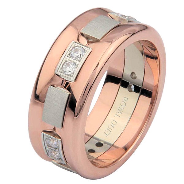 18 kt rose and white gold, comfort fit, 8.20 mm wide, diamond concaved ring. The band has a unique mix of rose and white gold with diamonds set in the center. The ring is concaved. It has approximately 0.35 ct tw round brilliant cut diamonds, that are VS1-2 in clarity and G-H in color. The rose gold is polished and the white gold is brushed. Different finishes may be selected or specified.
