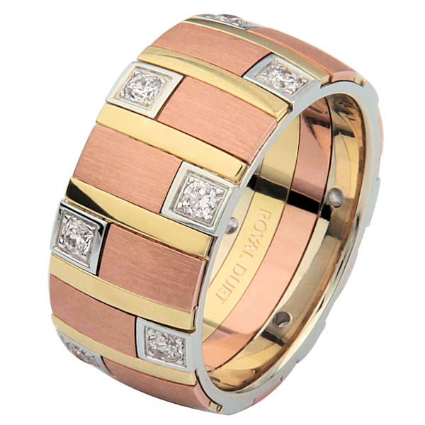 14 kt tri-color gold, comfort fit, 9.40 mm wide, diamond ring. The ring uniquely combines yellow, rose, and white gold together with diamonds set around the whole ring. It has approximately 0.49 ct tw round brilliant cut diamonds, that are VS1-2 in clarity and G-H in color. The rose gold portion has a brushed finish while the white and yellow gold are polished. Different finishes may be selected or specified.