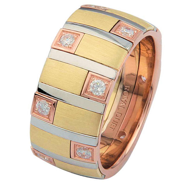 18 kt tri-color gold, comfort fit, 9.40 mm wide, diamond ring. The ring uniquely combines yellow, rose, and white gold together with diamonds set around the whole ring. It has approximately 0.49 ct tw round brilliant cut diamonds, that are VS1-2 in clarity and G-H in color. The yellow gold portion has a brushed finish while the white and rose gold are polished. Different finishes may be selected or specified.