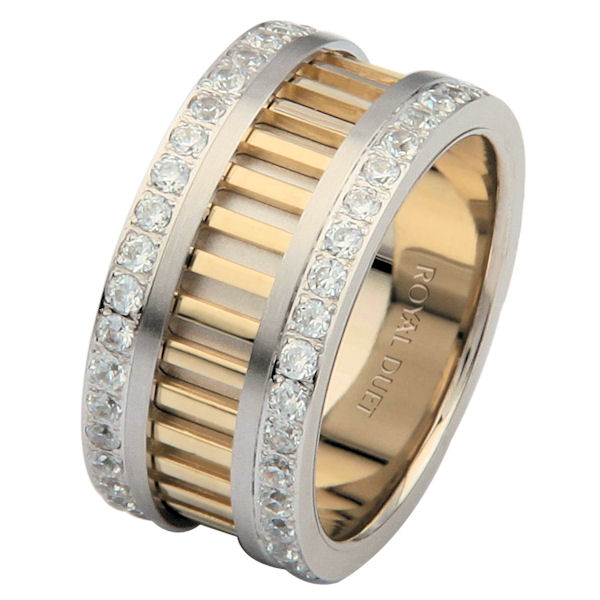 18 kt two-tone gold, comfort fit, 10.0 mm wide, diamond eternity ring. The band combines white and yellow gold in a unique design with diamond rows on each side of the band. The diamonds go around the whole ring. It has approximately 1.20 ct tw round brilliant cut diamonds, that are VS1-2 in clarity and G-H in color. The diamond weights will vary depending on the size of the ring.