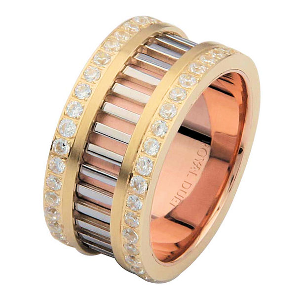 18 kt tri-color, comfort fit, 10.0 mm wide, diamond eternity ring. The band combines white, yellow and rose gold in a unique design with diamond rows on each side of the band. The diamonds go around the whole ring. It has approximately 1.20 ct tw brilliant cut diamonds, that are VS1-2 in clarity and G-H in color. The diamond weight may vary depending on the size of the ring.