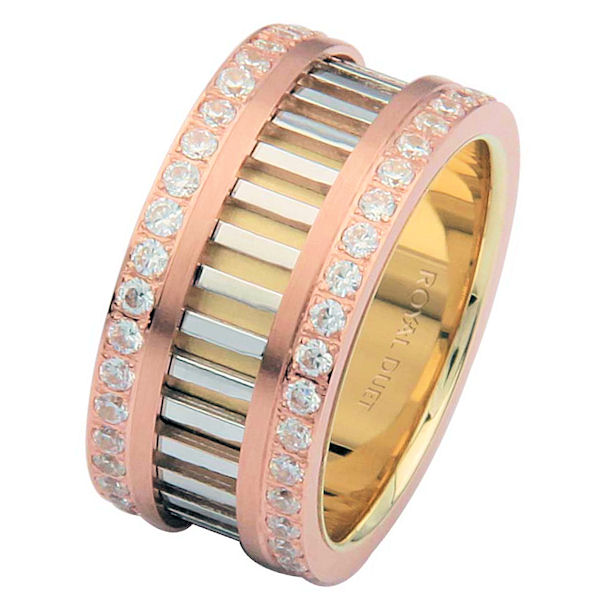 18 kt tri-color, comfort fit, 10.0 mm wide, diamond eternity ring. The band combines white, yellow and rose gold in a unique design with diamond rows on each side of the band. The diamonds go around the whole ring. It has approximately 1.20 ct tw brilliant cut diamonds, that are VS1-2 in clarity and G-H in color. The diamond weight may vary depending on the size of the ring.