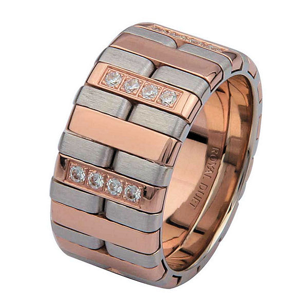 14 kt rose and white gold, comfort fit, 10.25 mm wide, diamond wedding ring. This band uniquely combines white and rose gold together to create a beautiful design with diamonds set in the ring. It has approximately 0.34 ct tw round brilliant cut diamonds, that are VS1-2 in clarity and G-H in color. The rose gold has a brush finish and the white gold has a polished finish. Different finishes may be selected or specified.