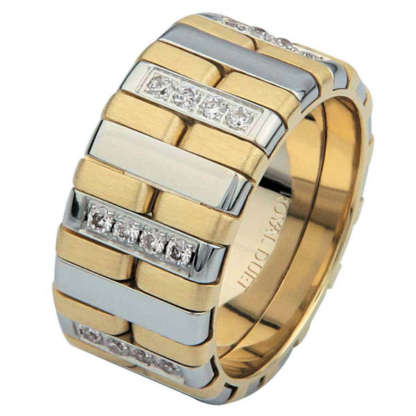 14 kt two-tone gold, comfort fit, 10.25 mm wide, diamond wedding ring. The band uniquely combines white and yellow gold together with diamonds set in the ring. It has approximately 0.34 ct tw round brilliant cut diamonds, that are VS1-2 in clarity and G-H in color.